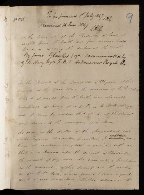 Paper, 'On the amount of the radiation of heat, at night, from the earth, and from various bodies placed on or near the surface of the earth' by James Glaisher