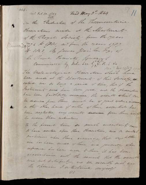 Published in Philosophical Transactions as 'On the reduction of the thermometrical observations made the apartments the Royal Society, from the years 1774 to 1781, and from the years 1787 to 1843'.