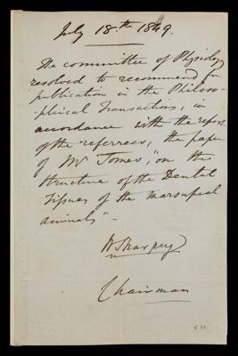 Letter from William Sharpey, on behalf of the Committee of Physiology, on a paper 'On the structure of the dental tissues of marsupial animals, and more especially of the enamel' by John Tomes