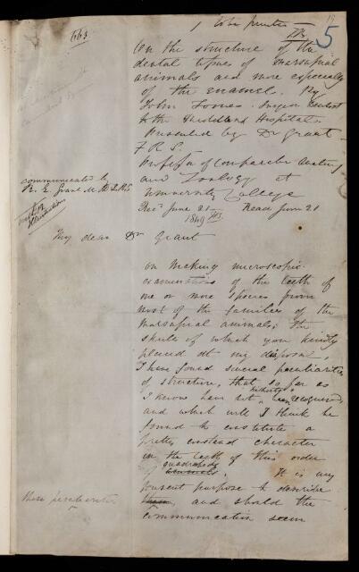 John Tomes, Paper, 'On the structure of the dental tissues of marsupial animals and more especially of the enamel' by John Tomes, 20 June 1849, PT/36/5, The Royal Society Archives, London, https://makingscience.royalsociety.org/items/pt_36_5/paper-on-the-structure-of-the-dental-tissues-of-marsupial-animals-and-more-especially-of-the-enamel-by-john-tomes, accessed on 14 April 2026