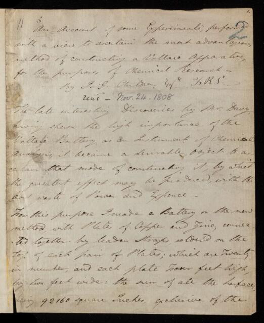 John George Children, Paper, 'An account of some experiments, performed with a view to ascertain the most advantageous method of constructing a voltaic apparatus, for the purposes of chemical research' by J [John] G [George] Children, 1808, PT/3/2, The Royal Society Archives, London, https://makingscience.royalsociety.org/items/pt_3_2/paper-an-account-of-some-experiments-performed-with-a-view-to-ascertain-the-most-advantageous-method-of-constructing-a-voltaic-apparatus-for-the-purposes-of-chemical-research-by-j-john-g-george-children, accessed on 09 December 2025