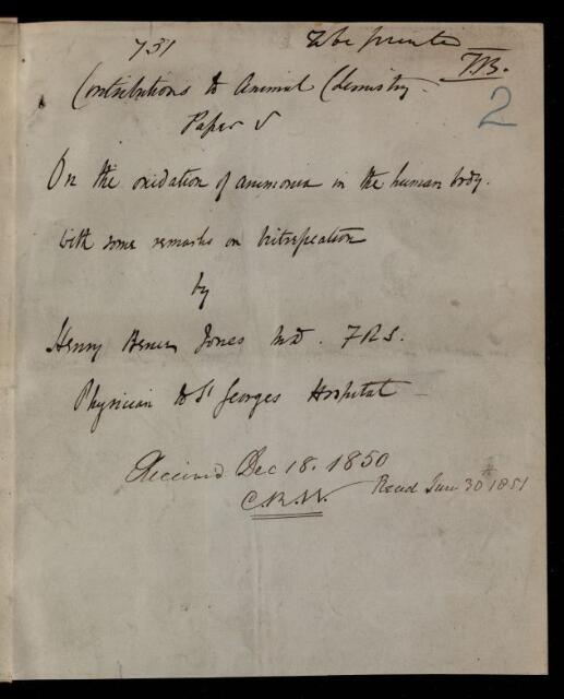 Henry Bence Jones, Paper, 'Contributions to animal chemistry. Paper V. On the oxidation of ammonia in the human body, with some remarks on nitrification' by Henry Bence Jones, 1850, PT/42/2, The Royal Society Archives, London, https://makingscience.royalsociety.org/items/pt_42_2/paper-contributions-to-animal-chemistry-paper-v-on-the-oxidation-of-ammonia-in-the-human-body-with-some-remarks-on-nitrification-by-henry-bence-jones, accessed on 06 December 2025