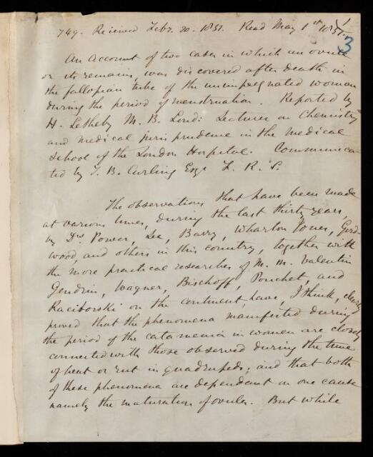 Henry Letheby, Paper, 'An account of two cases in which an ovule or its remains, was discovered after death in the fallopian tube of the unimpregnated woman during the period of menstruation' by H [Henry] Letheby, 1851, PT/43/3, The Royal Society Archives, London, https://makingscience.royalsociety.org/items/pt_43_3/paper-an-account-of-two-cases-in-which-an-ovule-or-its-remains-was-discovered-after-death-in-the-fallopian-tube-of-the-unimpregnated-woman-during-the-period-of-menstruation-by-h-henry-letheby, accessed on 17 January 2026