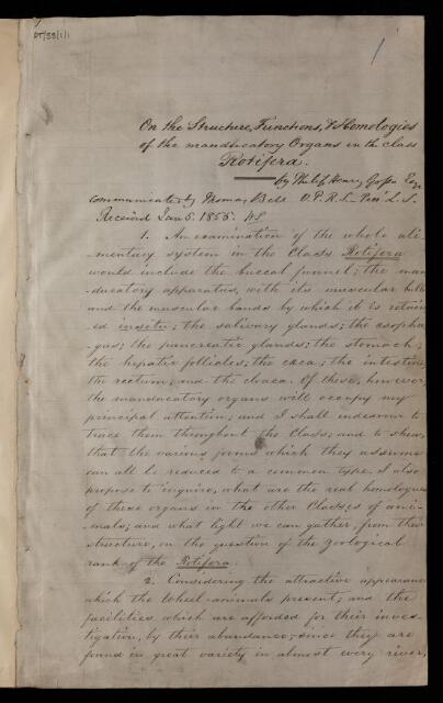 Philip Henry Gosse, Paper, 'On the structure, functions, and homologies of the manducatory organs in the class Rotifera' by Philip Henry Gosse, 20 December 1854, PT/53/1, The Royal Society Archives, London, https://makingscience.royalsociety.org/items/pt_53_1/paper-on-the-structure-functions-and-homologies-of-the-manducatory-organs-in-the-class-rotifera-by-philip-henry-gosse, accessed on 10 November 2025