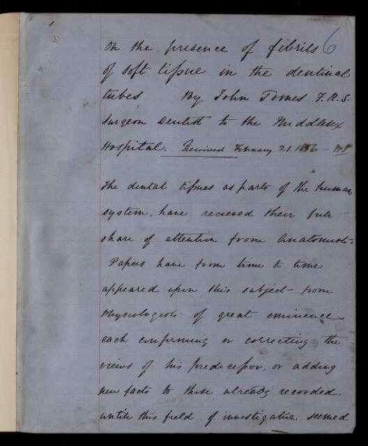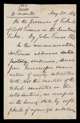 John Tomes, Paper, 'On the presence of fibrils of soft tissue in the dentinal tubes' by John Tomes, 1856, PT/53/6, The Royal Society Archives, London, https://makingscience.royalsociety.org/items/pt_53_6/paper-on-the-presence-of-fibrils-of-soft-tissue-in-the-dentinal-tubes-by-john-tomes, accessed on 09 February 2026