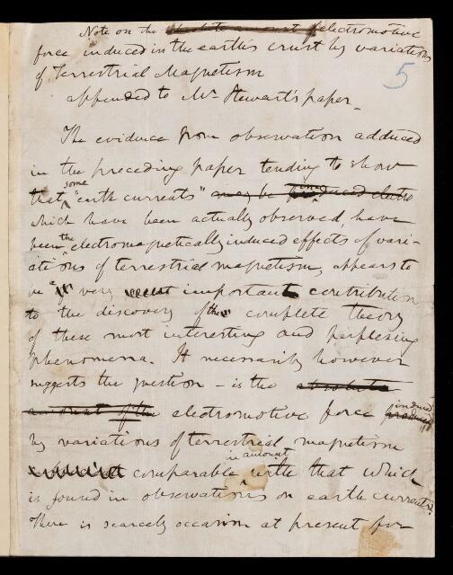 William Thomson, Paper, 'Note on the electromotive force induced in the earth's crust by variations of terrestrial magnetism' by [William Thomson], 1862, PT/66/5, The Royal Society Archives, London, https://makingscience.royalsociety.org/items/pt_66_5/paper-note-on-the-electromotive-force-induced-in-the-earths-crust-by-variations-of-terrestrial-magnetism-by-william-thomson, accessed on 17 March 2026
