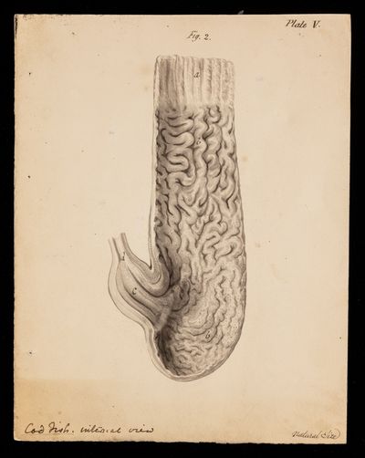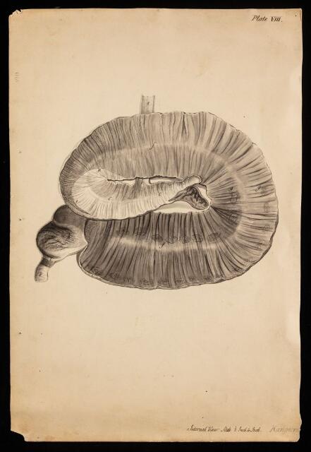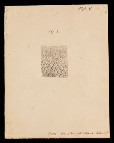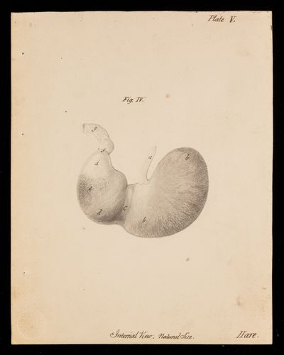 Plates by William Clift intended for publication in Everard Home's paper titled 'Observations on the structure of the stomachs of different animals, with a view to elucidate the process of converting animal and vegetable substances into chyle'. The paper was published in volume 97 of Philosophical Transactions.