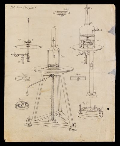 George Rennie, Diagram, 'Elevation of the apparatus for trying the friction of water' by unknown artist, 1831, PT/73/14/4, The Royal Society Archives, London, https://makingscience.royalsociety.org/items/pt_73_14_4/diagram-elevation-of-the-apparatus-for-trying-the-friction-of-water-by-unknown-artist, accessed on 12 December 2025