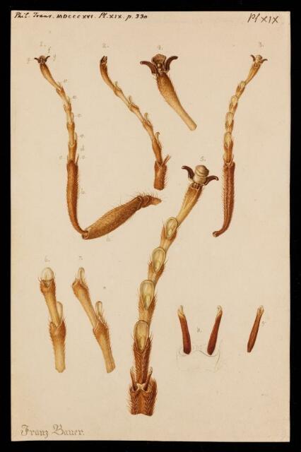 Plate 19, figures 1-9 showing nine views of legs from the yellow saw-fly [Cimbex lutea] at x100, x400, and x1600 magnification. The paintings are inscribed above with publication and plate details, the latter repeated. Signed lower left 'Franz Bauer'. Royal Society stamp verso, with an inscription in ink: 'Figs. 1, 2, 3 are magnified 100 times. Figs. 4, 5, 6, 7 - 400 times and Figs. 8, 9, - 1600 times.'