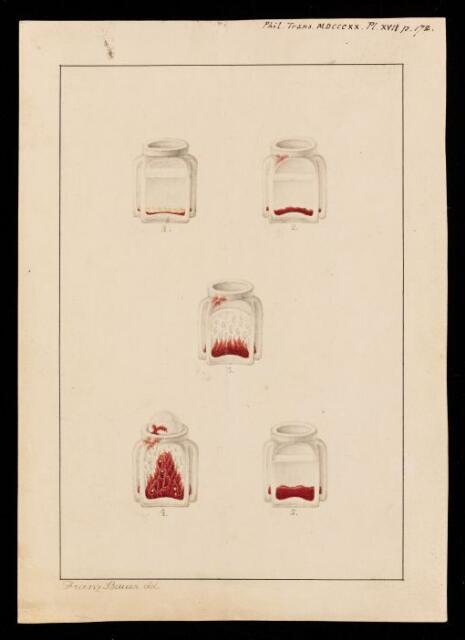 Plate 17 containing five figures showing Bauer's attempts to grow algae in glass jars from specimens returned to England by Captain John Ross's expedition to Baffin's Bay [Baffin Bay, between Baffin Island, Nunavut, Canada and Greenland]. The work is inscribed with publication and plate details. Signed lower left 'Franz Bauer del.' Royal Society stamp verso.