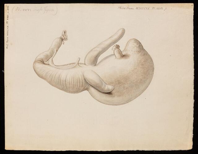 Plate 26 showing a study of the distended stomach of a dungong [Dugong dugon]. The work is inscribed with publication and plate details and very faint (erased?) pencil inscriptions below the main figure. Not signed. Royal Society stamp verso. Watermarked 'W Turner & Son'.