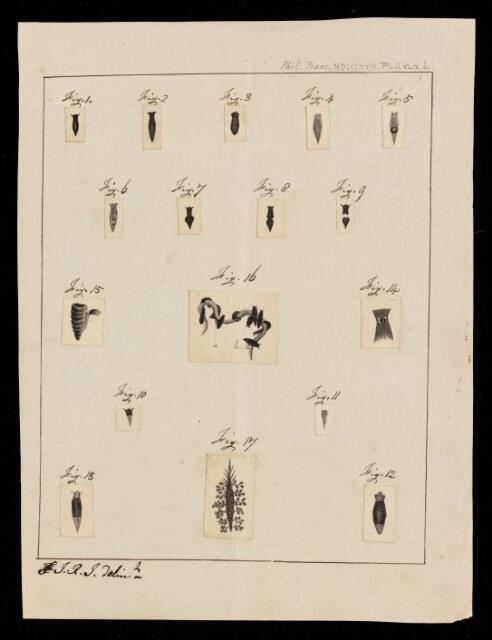 Plate 49 containing 17 figures pasted onto a backing sheet, showing the species P. cornuta; P. torva; P. brunnea; and P. lactea. With publication and plate details inscribed. Initialled lower left 'J.R.J. delint'. Royal Society stamp verso. Watermarked 'G&A 1818'. The manuscript for this paper is wanting.