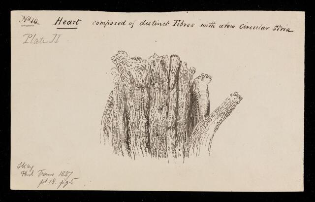 Plate 18, figure 5 showing a muscular fibre with circular striae from the human heart. Inscribed with title, publication, and plate details. An ink inscription next to title reads 'composed of distinct Fibres with a few circular striae'. Not signed. The manuscript for this paper is wanting.