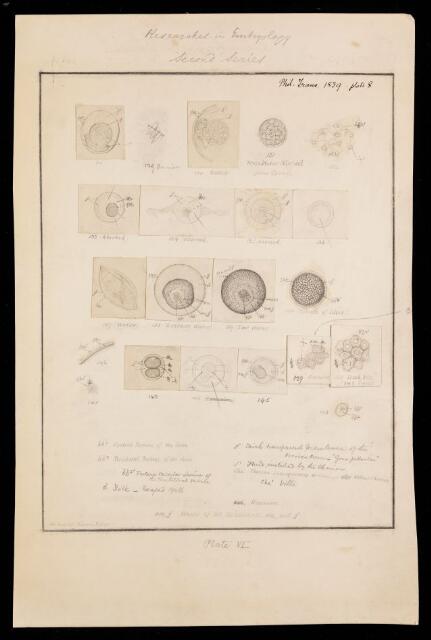 Plate 8, figures 128-150 showing ova of the rabbit [Lepus cuniculus; Oryctolagus cuniculus; European rabbit], both aborted and in development into embryos. Inscribed with publication and plate details. Figures 128-130, 133-139, 143-145, and 150 drawn separately and pasted onto backing sheet. Signed in graphite bottom left 'Ad Nat. del. Martin Barry'. The manuscript for this paper is wanting.