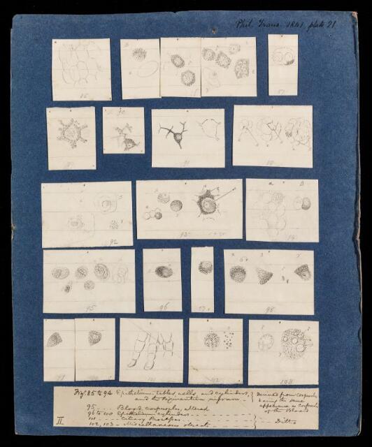 Plate 21, figures 85-103 showing epithelium cells and blood corpuscles from a tadpole, a human, and a duck. Inscribed with publication and plate details. Figures drawn separately and mounted onto backing board. Not signed.