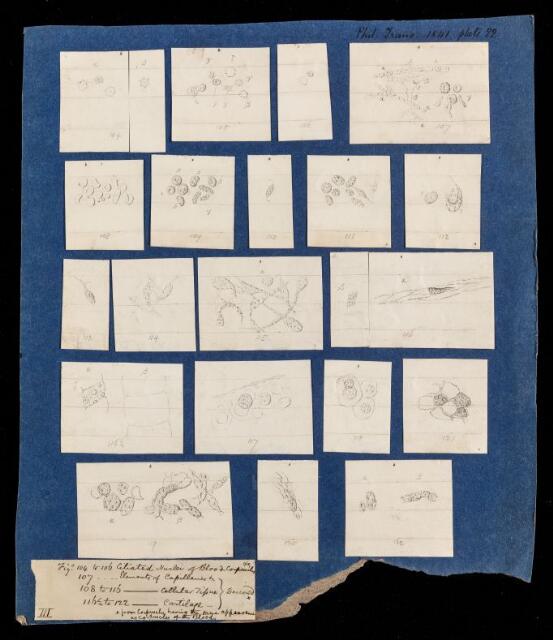 Plate 22, figures 104-122 showing blood corpuscles from foetal animals including an ox [Bos taurus; cattle], a rabbit [Lepus cuniculus; Oryctolagus cuniculus; European rabbit], a common fowl [Phasianus gallus; chicken], and a tadpole. Inscribed with publication and plate details. Figures drawn separately and mounted onto backing board. Not signed.