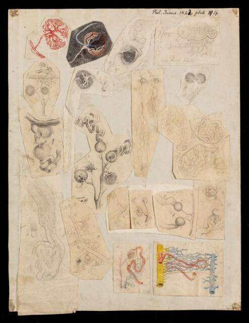 Plate 4, figures 1-17 showing Malpighian bodies in the livers of various animals, including a horse, a rabbit, a human, a guinea pig, a parrot, a boa constrictor, and a frog. The last two figures show diagrams of renal circulation in mammalia. Inscribed with publication and plate details recto and verso. Figures drawn separately and mounted onto backing sheet. Not signed.