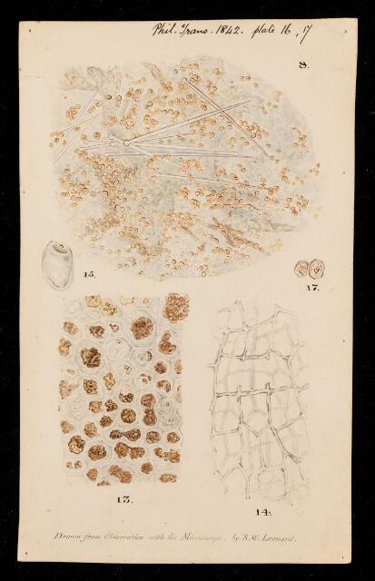 Plate 16, figure 8 and plate 17, figures 5-7 and 9 (labelled here as figures 13-15 and 17) showing cytoblasts and cellular structure in various Coralliidae, including the Anthopora [Stylophora, genus of stony corals] and the Nullipora. Inscribed with publication and plate details recto and verso. Signed at bottom in ink, 'Drawn from Observation with the Microscope, by S. W. Leonard.'