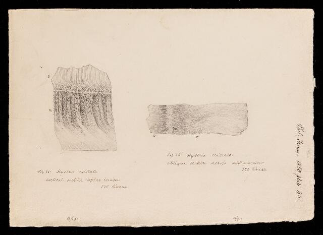 Plate 45, figures 35-36 showing sections of the upper incisor of the Hystrix cristata [crested porcupine]. Inscribed with figure, publication, and plate details. Each figure is dated in ink, figure 35 as 19 January 1850 and figure 36 as 21 January 1850. Not signed.