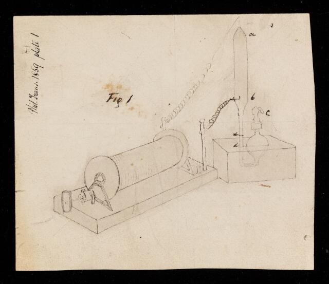 Compressed version of plate 9, figure 8 (labelled here as figure 1) showing a vacuum tube in which platinum wires are hermetically sealed, attached to a carbonic acid generator. Inscribed with publication and plate details. Part of a graphite illustration of a vacuum tube visible verso. Not signed. The manuscript for this paper is wanting.