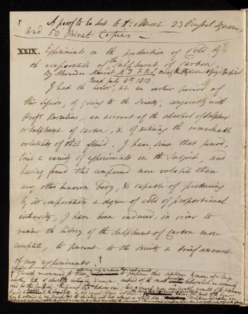 Alexander John Gaspard Marcet, Paper, 'Experiments on the production of cold by the evaporation of the sulphuret of carbon' by Alexander Marcet, 1813, PT/7/29, The Royal Society Archives, London, https://makingscience.royalsociety.org/items/pt_7_29/paper-experiments-on-the-production-of-cold-by-the-evaporation-of-the-sulphuret-of-carbon-by-alexander-marcet, accessed on 08 February 2026