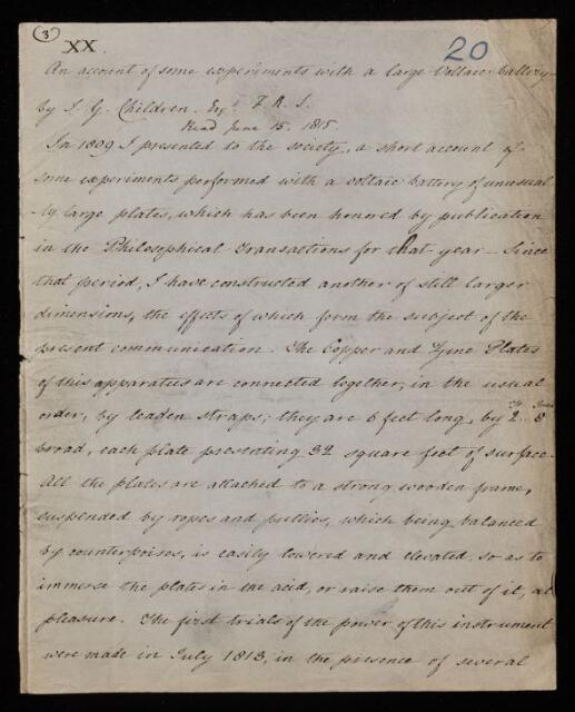 John George Children, Paper, 'An account of some experiments with a large voltaic battery' by J G [John George] Children, 1815, PT/9/20, The Royal Society Archives, London, https://makingscience.royalsociety.org/items/pt_9_20/paper-an-account-of-some-experiments-with-a-large-voltaic-battery-by-j-g-john-george-children, accessed on 09 December 2025