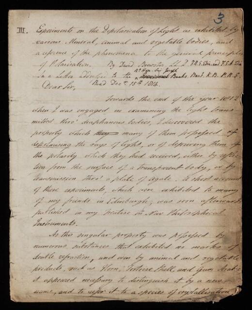 David Brewster, Paper, 'Experiments on the depolarisation of light as exhibited by various mineral, animal and vegetable bodies, and a reference of the phenomena to the general principles of polarisation' by David Brewster in a letter to the Rt Hon Sir Joseph Banks, 22 October 1814, PT/9/3, The Royal Society Archives, London, https://makingscience.royalsociety.org/items/pt_9_3/paper-experiments-on-the-depolarisation-of-light-as-exhibited-by-various-mineral-animal-and-vegetable-bodies-and-a-reference-of-the-phenomena-to-the-general-principles-of-polarisation-by-david-brewster-in-a-letter-to-the-rt-hon-sir-joseph-banks, accessed on 14 December 2025
