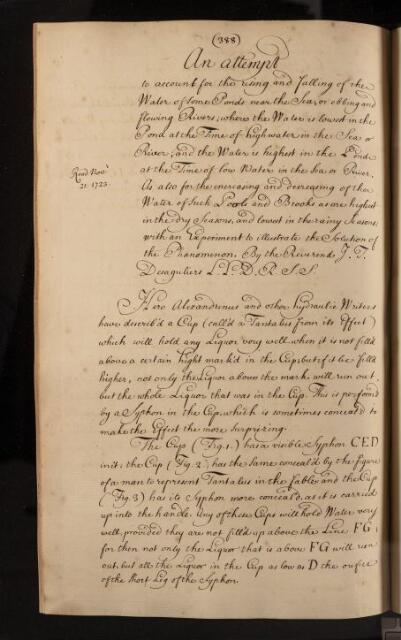 Paper, 'An attempt to account for the rising and falling of the water of some ponds near the sea or ebbing and flowing rivers; where the water is lowest in the pond, at the time of high water in the sea or river; and the water is highest in the pond, at the time of low water in the sea or river. As also for the increasing or decreasing of the water of such pools and brooks as are highest in the dry seasons, and lowest in the rainy seasons: with an experiment to illustrate the solution of the phaenomena' by J T [John Theophilus] Desaguliers