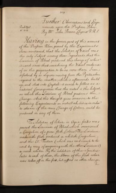 'Further Observations and Experiments upon the Prussian Blew [blue]' by John Brown, Chymist