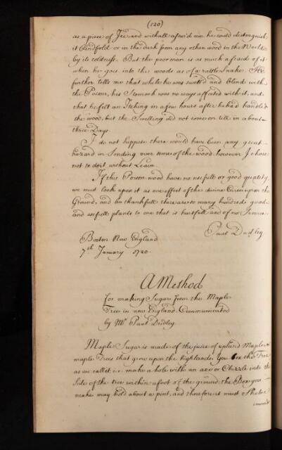 'A Method for making Sugar from the Maple Tree in new England communicated by Mr Paul Dudley'