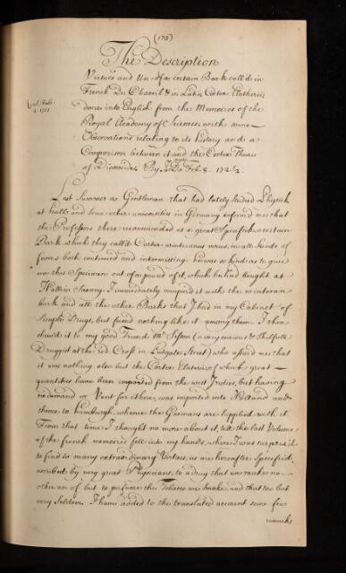 'Description Virtues and Use of a certain Bark call'd in French Du Chaeril and in Latin Cortex Elatherii done into English from the Memoires of the Royal Academy of Sciences with some Observations relating to its history and a Comparison between it and the Cortex Thuris of Dioscorides by J Douglas', 1721, RBO/11/47, The Royal Society Archives, London, https://makingscience.royalsociety.org/items/rbo_11_47/description-virtues-and-use-of-a-certain-bark-calld-in-french-du-chaeril-and-in-latin-cortex-elatherii-done-into-english-from-the-memoires-of-the-royal-academy-of-sciences-with-some-observations-relating-to-its-history-and-a-comparison-between-it-and-the-cortex-thuris-of-dioscorides-by-j-douglas, accessed on 23 January 2026