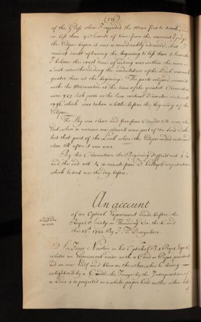 Paper, 'An account of an optical experiment made before the Royal Society on Thursday 6 and 13 December 1722' by J T [John Theophilus] Desaguliers