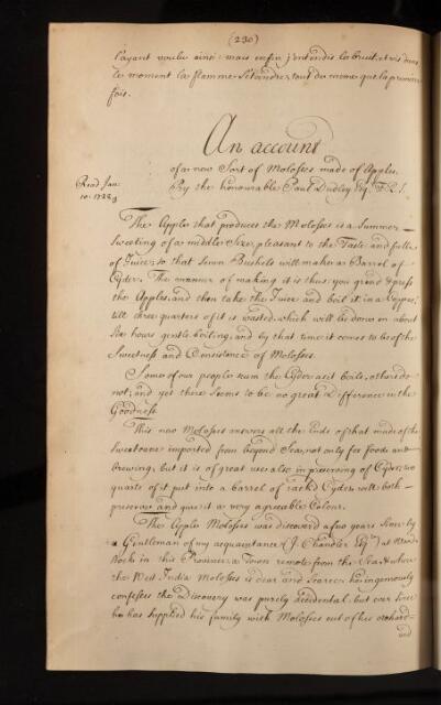 'An account of a new Sort of Molosses made of Apples' by Paul Dudley, 1723, RBO/11/69, The Royal Society Archives, London, https://makingscience.royalsociety.org/items/rbo_11_69/an-account-of-a-new-sort-of-molosses-made-of-apples-by-paul-dudley, accessed on 06 March 2026
