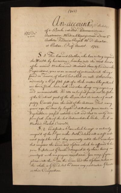 Account by Dr Stukeley of Frederick Ruysch's book entitled 'Adversariorum Anatomico-Medico-Chirurgicorum Decas'