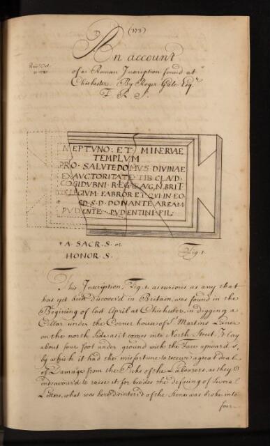 'Account of a Roman Inscription found at Chichester' by Roger Gale, 31 October 1723, RBO/11/99, The Royal Society Archives, London, https://makingscience.royalsociety.org/items/rbo_11_99/account-of-a-roman-inscription-found-at-chichester-by-roger-gale, accessed on 07 November 2025
