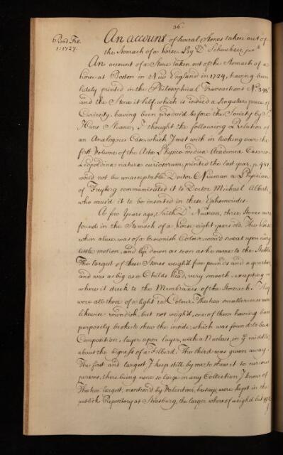 'An account of Several Stones taken out of the Stomach of a horse' by Dr Scheuchzer, 1727, RBO/13/20, The Royal Society Archives, London, https://makingscience.royalsociety.org/items/rbo_13_20/an-account-of-several-stones-taken-out-of-the-stomach-of-a-horse-by-dr-scheuchzer, accessed on 19 April 2026