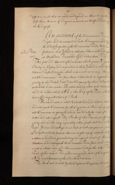 'An account of the Cinnamon Tree in Ceylon and its several Sorts communicated by the Chief Inspector of the Cinnamon Trade and manufacture in that Island to Albertus Seba, a noted Druggist at Amsterdam'