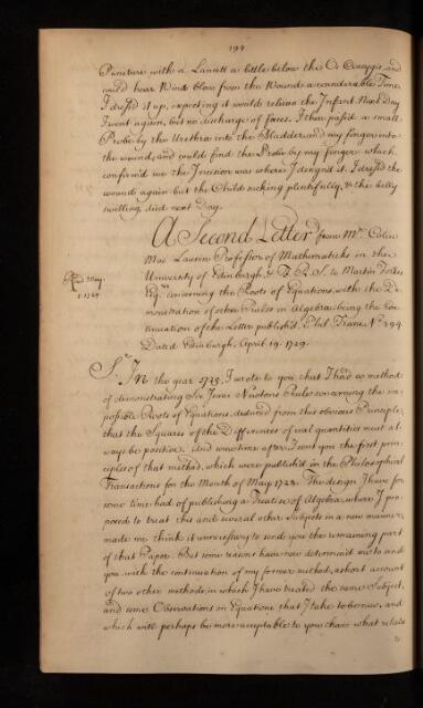 Original letter dated 19 April 1729 at Edinburgh continuation of a letter published in 'Philosophical Transactions'