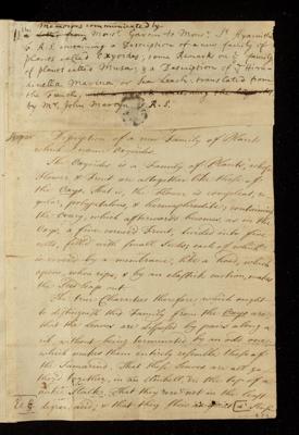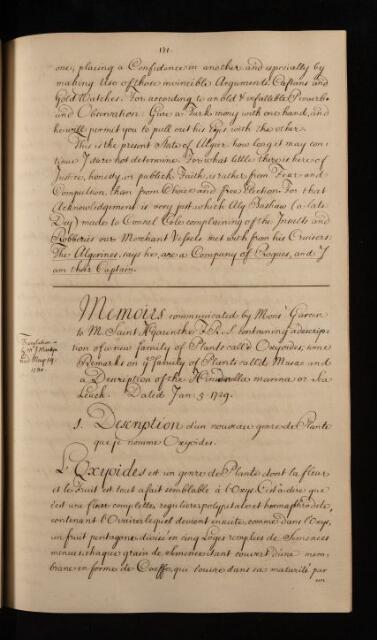 Paper, 'Memoirs communicated by Monsr Garcin to Monsr St Hyacinthe FRS containing a description of a new family of plants called oxyoides; some remarks on the family of plants called musa; and a description of the hirudinella marina, or sea leach' by Laurent Garcin