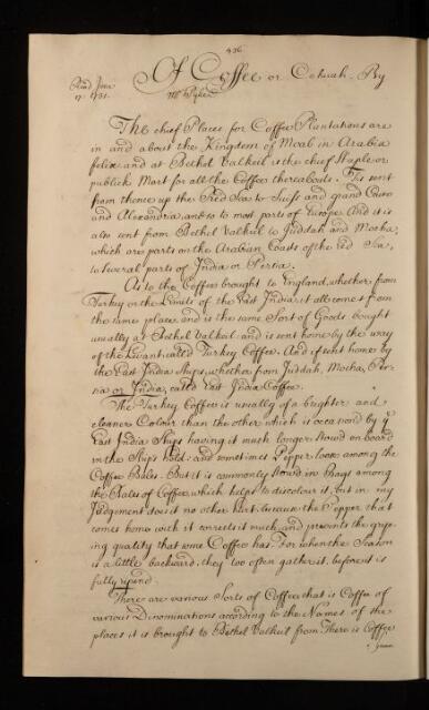 'Of Coffee or Cahuah' by Mr Pyke, 1731, RBO/15/94, The Royal Society Archives, London, https://makingscience.royalsociety.org/items/rbo_15_94/of-coffee-or-cahuah-by-mr-pyke, accessed on 09 March 2026