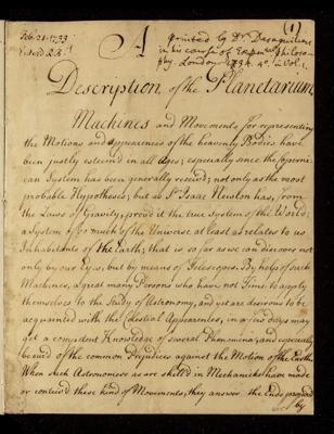Paper, Description of a planetarium by J T [John Theophilus] Desaguliers