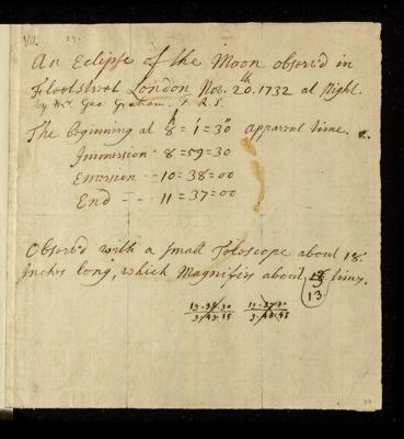 Eclipse of the Moon observed in Fleet Street London on the night of 20 November 1732 by George Graham, 1732, RBO/18/8, The Royal Society Archives, London, https://makingscience.royalsociety.org/items/rbo_18_8/eclipse-of-the-moon-observed-in-fleet-street-london-on-the-night-of-20-november-1732-by-george-graham, accessed on 14 March 2026