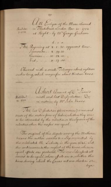 Paper, 'An eclipse of the moon observ'ed in Fleet Street, London, 20 November 1732 at night' by George Graham