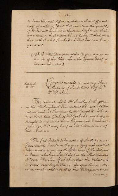 Paper, 'Experiments concerning the vibrations of pendulums' by William Derham