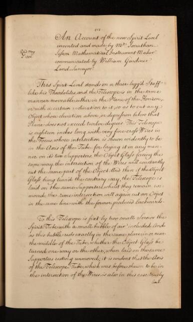 'Account of the new Spirit Level invented and made by Mr Jonathan Sisson Mathematical Instrument Maker' by William Gardiner, land-surveyor, 1736, RBO/19/62, The Royal Society Archives, London, https://makingscience.royalsociety.org/items/rbo_19_62/account-of-the-new-spirit-level-invented-and-made-by-mr-jonathan-sisson-mathematical-instrument-maker-by-william-gardiner-land-surveyor, accessed on 16 March 2026