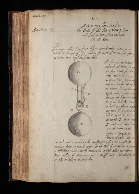 Robert Hooke, 'A New way for sounding the depth of the Sea without a Line and fetching Water from any depth' by Robert Hooke, 30 September 1663, RBO/2i/71, The Royal Society Archives, London, https://makingscience.royalsociety.org/items/rbo_2i_71/a-new-way-for-sounding-the-depth-of-the-sea-without-a-line-and-fetching-water-from-any-depth-by-robert-hooke, accessed on 08 December 2025