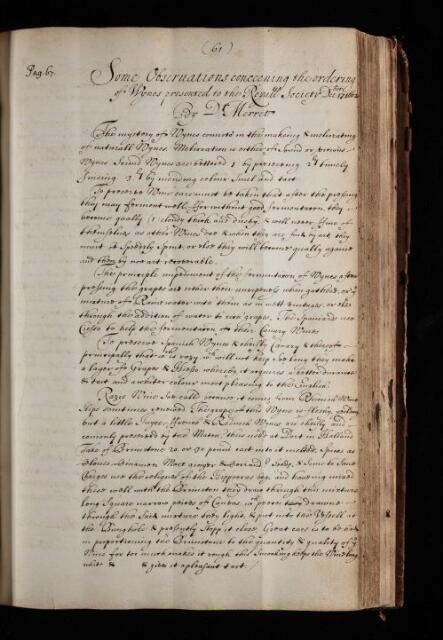 'Some Observations concerning the ordering of Wynes [wines] presented to the Royall Society' by Christopher Merrett