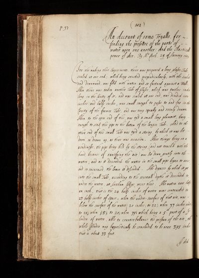 'An Account of some Tryalls for findeing the pressure of the parts of water upon one another And the Elasticall power of the Aire' by Robert Hooke