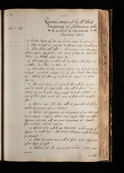 Robert Hooke, Questions formulated by Robert Hooke 'concerning the condensation of Air to be resolved by Experiments in the Compressing Engine', RBO/2ii/35, The Royal Society Archives, London, https://makingscience.royalsociety.org/items/rbo_2ii_35/questions-formulated-by-robert-hooke-concerning-the-condensation-of-air-to-be-resolved-by-experiments-in-the-compressing-engine, accessed on 14 November 2025