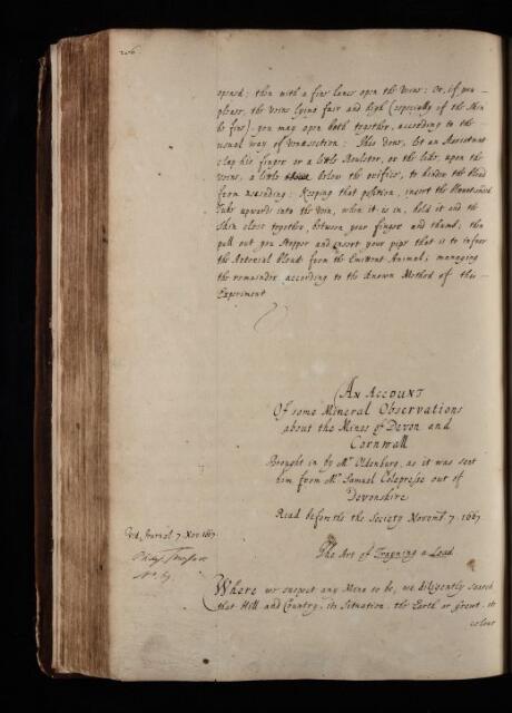 'An Account Of some Mineral Observations about the Mines of Devon and Cornwall' brought in by Henry Oldenburg